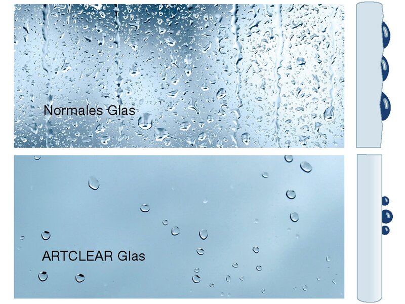 Optional können PRESTIGE Duschgläser mit ARTCLEAR Glas veredelt werden. Dadurch werden die Glasoberflächen besonders glatt, Schmutz- und Kalkreste finden kaum Halt. Dank der UV Aushärtung der Oberfläche hält dieser Effekt ein Duschenleben lang