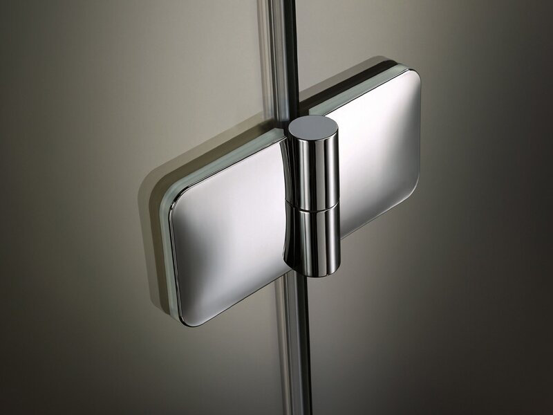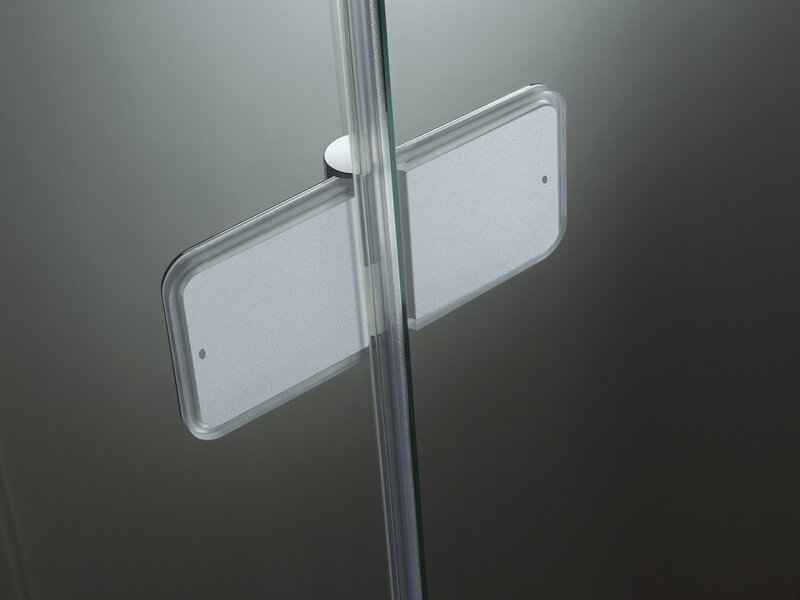 Scharniere und Beschläge sind an den Seitenflächen mit einem leicht grünlichen transparenten Kunststoff überzogen, passend zum Glas der Dusche. Dadurch wirken die Metallkörper besonders schmal und elegant und scheinen über der Glasoberfläche zu schweben.