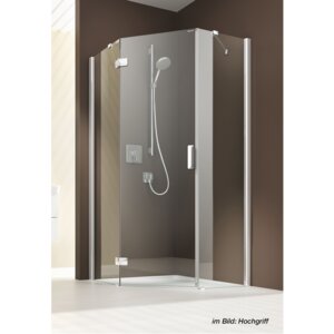 Ein Hebe-Senk Mechanismus im Flügelltür-Scharnier hebt die Duschtür beim Öffnen etwas auf und senkt sie wieder beim Schließen. Dadurcg streift die Tür beim Bewegen nicht am Boden und ist dennoch im geschlossenen Zustand möglichst dicht.