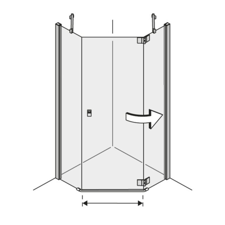 Ein Hebe-Senk Mechanismus im Pendeltür-Scharnier hebt die Duschtür beim Öffnen etwas auf und senkt sie wieder beim Schließen. Dadurch streift die Tür beim Bewegen nicht am Boden und ist dennoch im geschlossenen Zustand möglichst dicht.