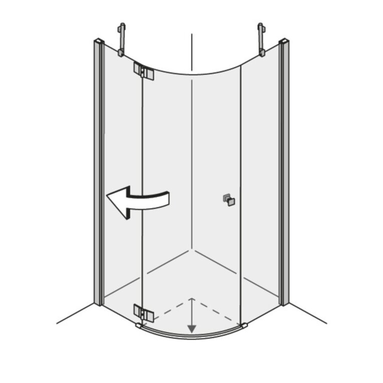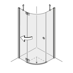 Ein Hebe-Senk Mechanismus im Pendeltür-Scharnier hebt die Duschtür beim Öffnen etwas auf und senkt sie wieder beim Schließen. Dadurch streift die Tür beim Bewegen nicht am Boden und ist dennoch im geschlossenen Zustand möglichst dicht.
