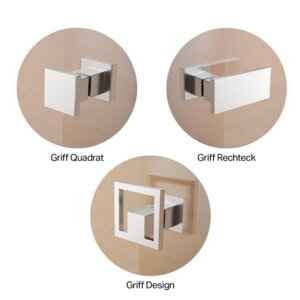An der Tür-Innenseite kommt immer ein einfach zu reinigender Knauf zum Einsatz, an der Tür-Außenseite können Sie zwischen 4 Griffarten wählen.