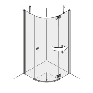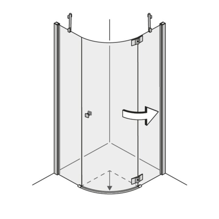 Ein Hebe-Senk Mechanismus im Pendeltür-Scharnier hebt die Duschtür beim Öffnen etwas auf und senkt sie wieder beim Schließen. Dadurch streift die Tür beim Bewegen nicht am Boden und ist dennoch im geschlossenen Zustand möglichst dicht.
