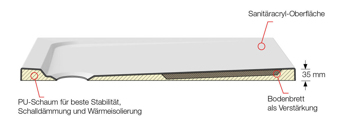 ARTFLOOR Duschwannen sind mit PU-Schaum hinterfüttert. Dadurch bekommt ARTFLOOR besondere Eigenschaften im Vergleich zu herkömmlichen Acrylwannen: