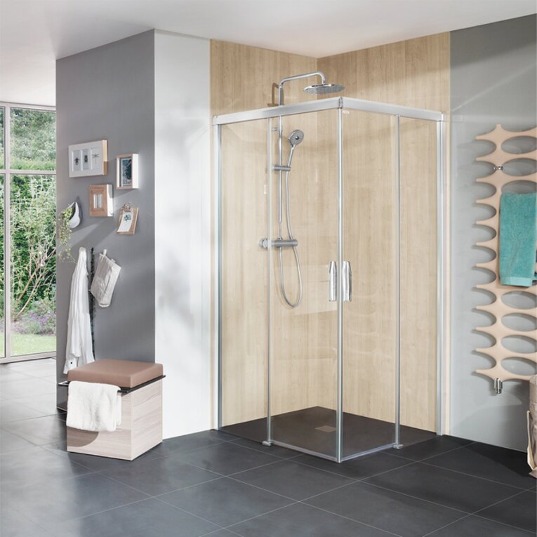 Exrtraschmal und aufs Maximum reduziert ist das patentierte Türführungs-System der MOVE. Besonders praktisch: Die Duschtüren sind mit Magneten fixiert und können zum Reinigen einfach weggeschwenkt werden.