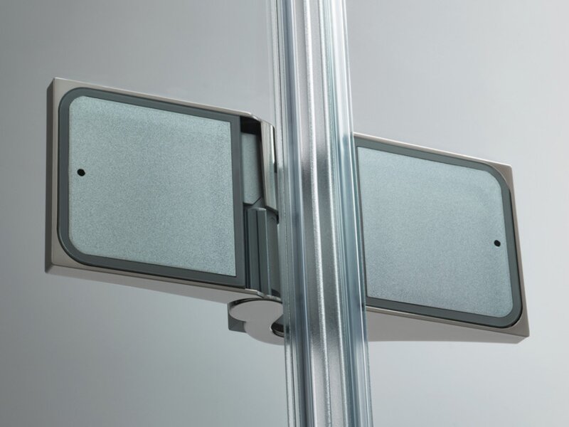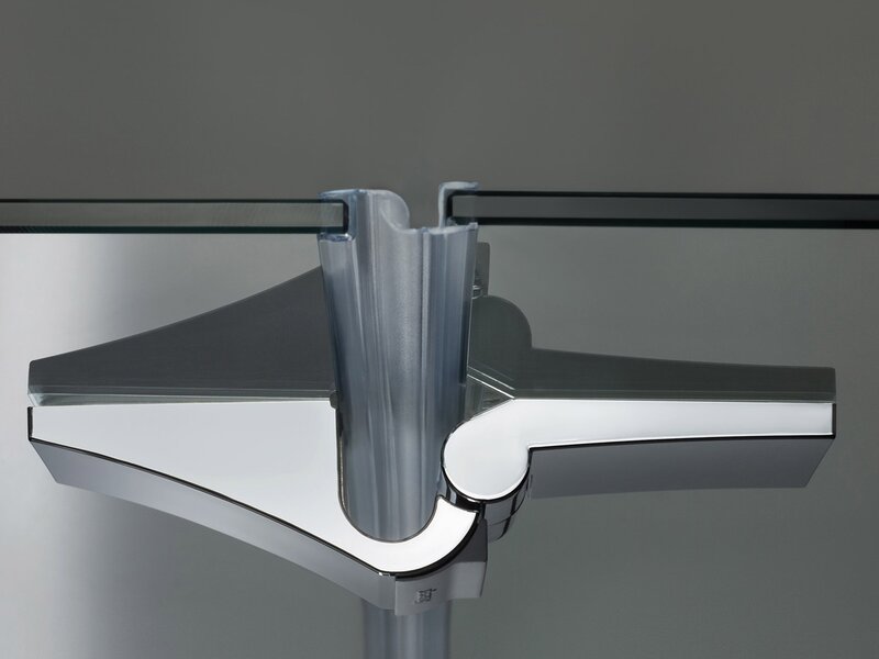 Die Scharniere sind mit zertifizierter Klebtechnik auf der Glas-Außenseite sicher verklebt. Dadurch ist die Glasinnenseite eine durchgehende glatte Fläche, die sehr einfach gereinigt werden kann.