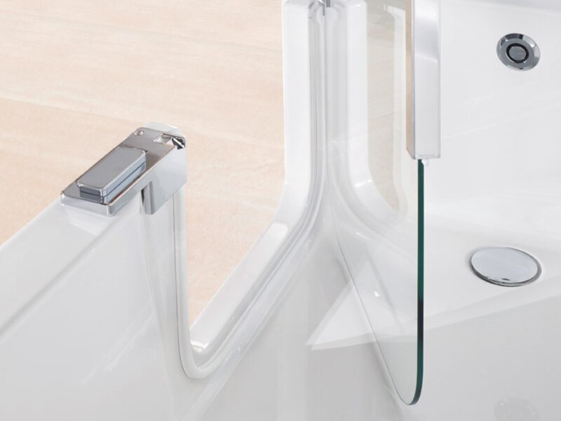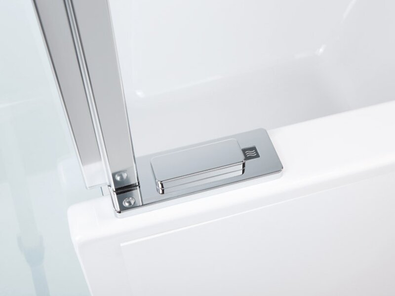 Der Sicherheitsverschluss ist mit dem Abfluss gekoppelt. Das Füllen der Wanne ist nur bei verriegelter Tür möglich.