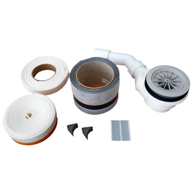 Ablaufgarnitur mit Wannendichtband-Set, zur Abdichtung und Schalldämmung zwischen ARTSTONE-Duschwanne, Baukörper und Fliese.